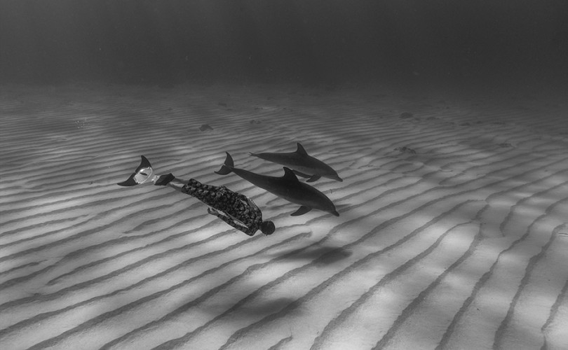 小笠原諸島を囲む、潜れば潜るほど青い海。2匹のイルカの傍らで波間に遊ぶその影を見たとき、僕だって眼を疑ったのだから。