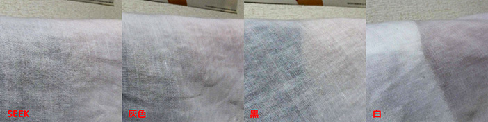 左から、SEEK CUT OFF PREMIUM、灰色(スーピマコットン)、黒、白の順で並んでいます。左側2つは境目がうっすらとしているのに対し、黒は意識しなくとも見え、白にいたっては境目をまるで強調するかのようにはっきりとでてきてしまっています。灰色が思った以上に健闘しましたが、並べてみると若干SEEK CUT OFF PREMIUMのほうが透けていないように思います。