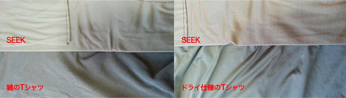 写真内上がSEEK CUT OFF PREMIUM、左の写真下が普通の綿のTシャツ。右の写真下はドライ仕様のTシャツです。