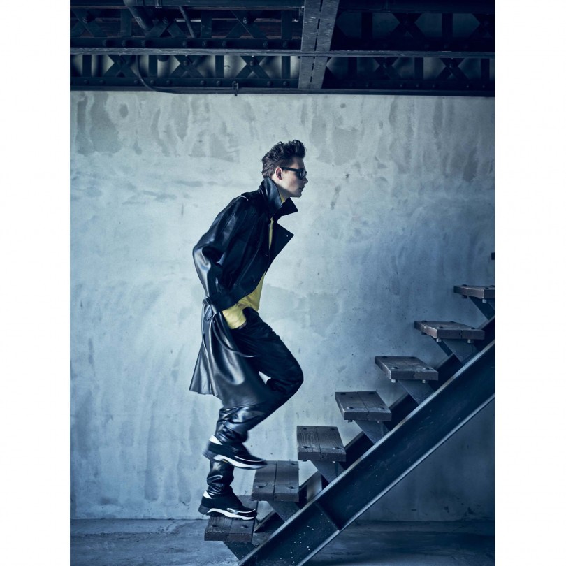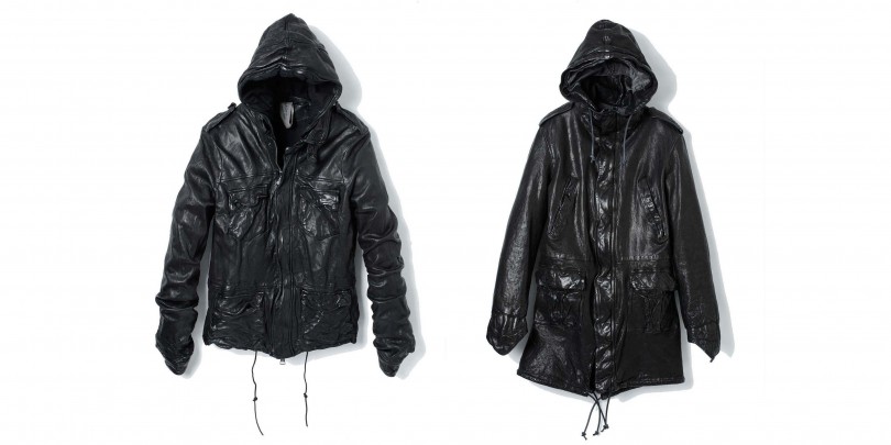 右/<ISAMU KATAYAMA BACKLASH(イサム カタヤマ バックラッシュ)>ミリタリーの定番モッズコートを、オールレザーで武骨にアップデート。ウォッシュをかけた肉厚のカーフレザーは、しっとりとした色気のある艶感が魅力。ディテールを踏襲したデザインで、スタイリングしやすいところもポイント。コート 302,400円(税込)