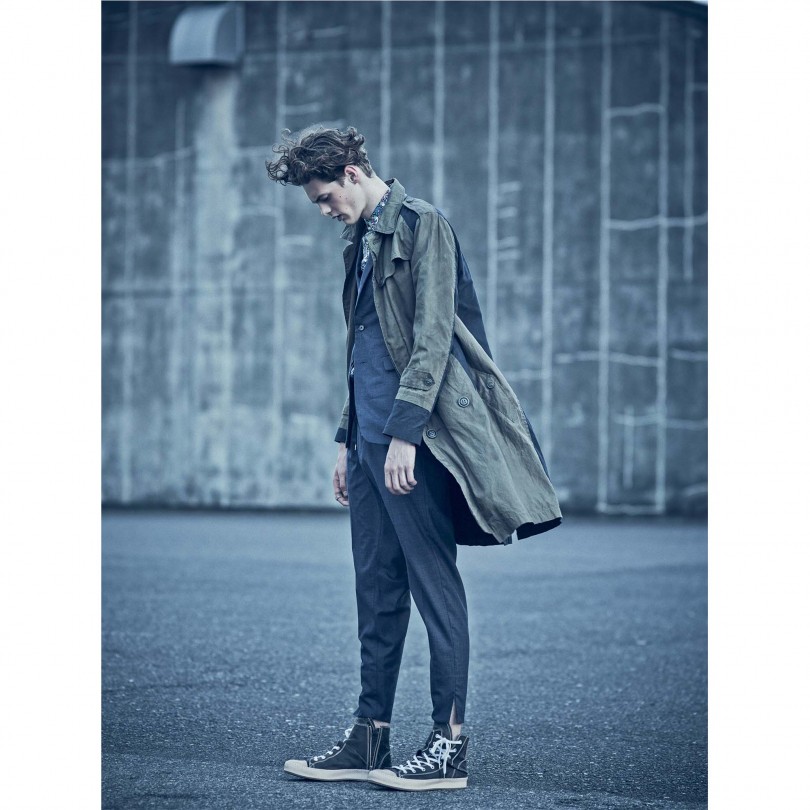 <MIHARA YASUHIRO(ミハラ ヤスヒロ)>2種類の素材を組み合わせたシングルトレンチコートは、ボタン位置によりダブルに見えるギミックもあり。身幅はたっぷりとしたボリュームシルエットで、ざっくりと羽織った姿がアーティスティックな印象に。ユーズド加工による色のくすみやシワ感が、モードなデザインをリアルクローズにまとめています。コート 97,200円(税込)