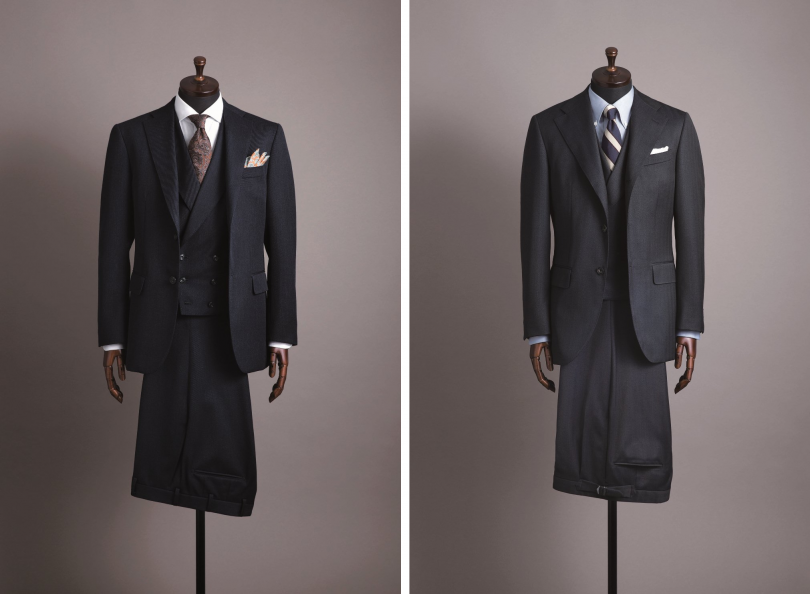 また<J.プレス>は、国的な生地の風合いを目指したというネイビーの梳毛生地は独特なハリコシとしなやかさを持っているのが特徴。気品あるワイドラペルのジャケットに2プリーツパンツを組み合わせ、クラシックなエレガンスを現代的なシルエットで表現している。