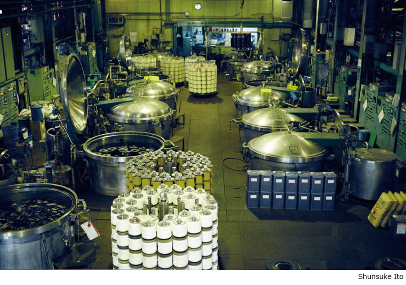 チーズと呼ばれる状態にまかれた糸を、染色用のキャリアに詰めたところ。高温で芯まで均一に染められる。