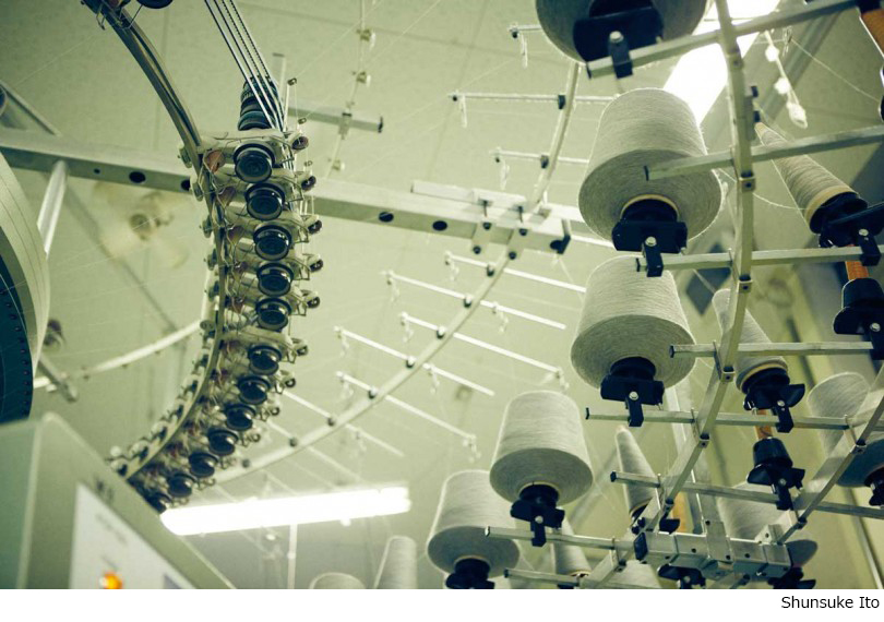 円形の機械が編み出すニット地は、心地よいセーターやトレーナーになる。無地も多色のジャガードも、編み方でデザインは無限。