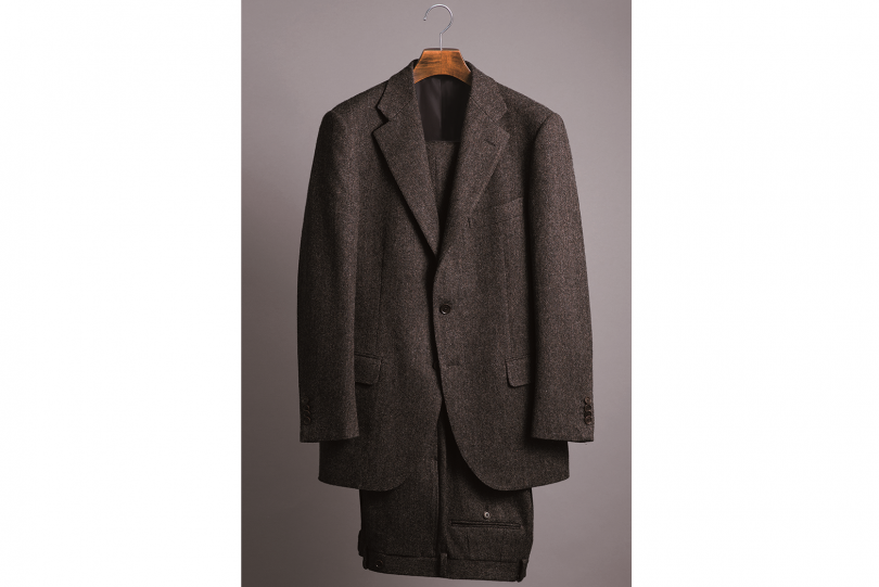 しっかりとしたショルダーライン、スラントポケットなど、英国のブランドらしいディテールを取り入れた一着は、<マッキントッシュ ロンドン>のもの。ミディアムグレイの梳毛生地は、綾織で表面にアンティーク風のニュアンスをつけたもの。トラディショナルの精神が息づくスーツに仕上がりました。