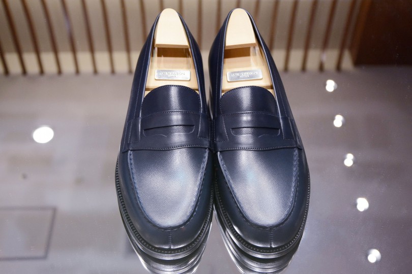 ブルーシューズの傑作、ジェイエムウエストンの『180』 をベースに、ラグジュアリーなローファーを別注。キャビアのような輝きを放つグレインレザーと、ボックスカーフとのコンビネーションは、吸い込まれそうなほどに深淵。インソールにいたるまで美しいブルーにこだわり尽くしました。