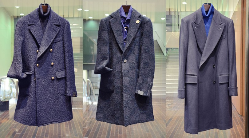 エレガンス回帰の潮流をいち早くキャッチした、3着のネイビーコートを選び抜きました。独創的な市松模様のブークレ生地を使った<ラルディーニ>、クラシックなダンディズムが漂う<ハズバンズ>、ビーバー生地やディテールの男らしさが魅力の<タリアトーレ>。三者三様の個性を味わってください。