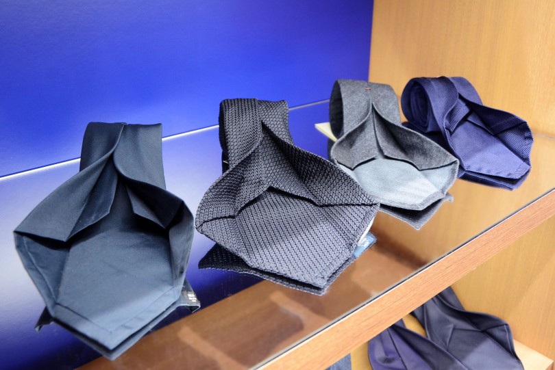 大人の男にとって必要な要素である、誠実さや清潔感をアピールしてくれる、ブルー無地のネクタイ。今回はそれを、まるでスカーフのような「セッテピエゲ(7つ折り)」で表現することで、軽妙なエレガンスをプラスしました。同色だからこそ際立つ、各ブランドの表情の違いも楽しみのひとつです。
