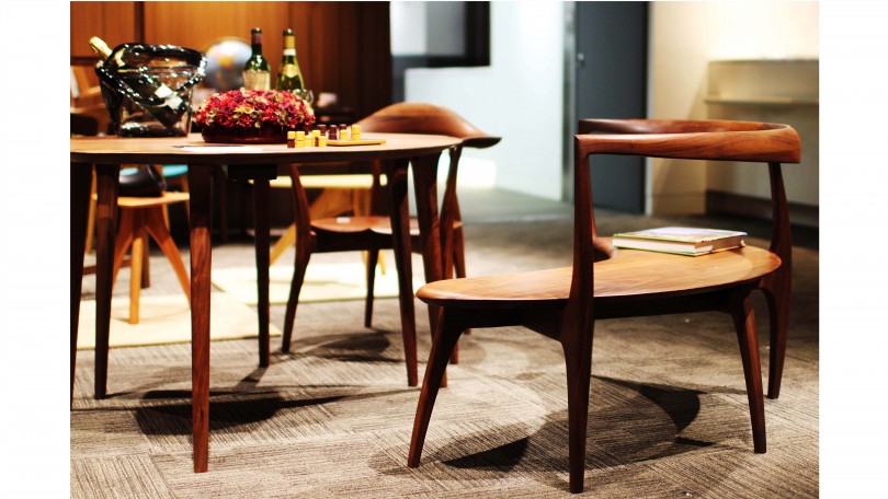 「このベンチは通称・一人がけのベンチ。僕はこれを贅沢に独り占めするんです。中心に座ってランチする時もあれば、時に深い窪みに持たれて本を片手にシャンパンを飲み、また、足を伸ばしてお気に入りの一冊に読みふけり秋の夜長を過ごす。座り心地はもとい、なんといっても木の触り心地が何とも言えない。まるで女性の肌の様になめらかでほんのり温かい。あぁ、このベンチの座り心地を彼女と一緒に確かめたかったなぁ…。」