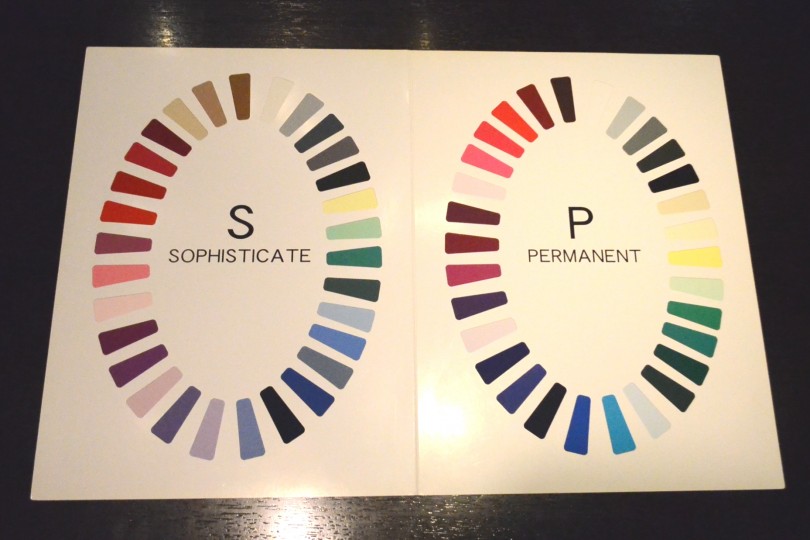 色は数種類ありますが、同じ色の束でも上記のパーソナルカラーグループに分かれています。例えば赤なら、ディライトの赤、ソフィスティケートの赤、ハーベストの赤、パーマネントの赤。つまり赤が似合わないと思っていたとしても、似合う赤は必ずあるということです。