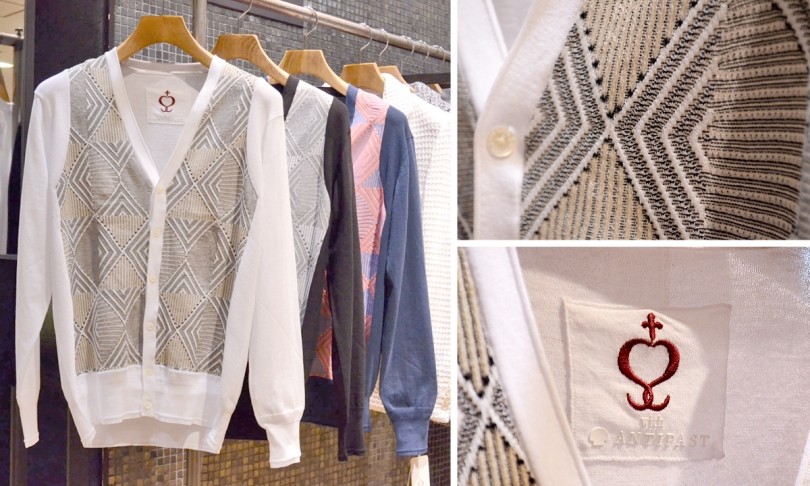 ソックスブランドの<アンティパスト>コラボレーションした薄手のカーディガン。独創的な幾何学模様を靴下の編地で表現。ジャケットインナーや、羽織としてお使いいただけます。