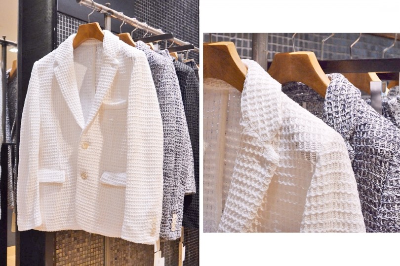 綿ギマを使用したバケット編みでの清涼感のあるジャケットは、パターンをより立体的に進化させキレイ目なシルエットに仕上げています。