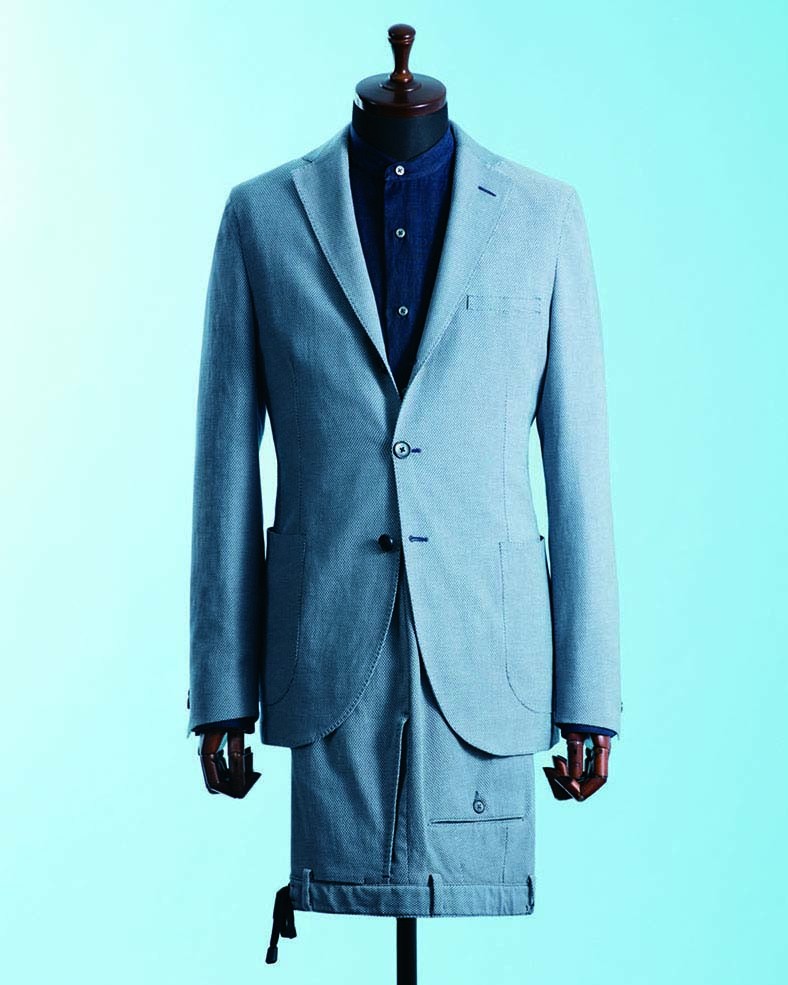 <フランネル ベイ>スーツ 89,640円ナポリのやわらかい仕立てと、個性を放つ素材で他にはない一着は、バーズアイ柄のジャージー素材がスポーティな印象。芯なしジャケットにドローストリングス入りのパンツがセットになったリラックス&モダンな一着です。