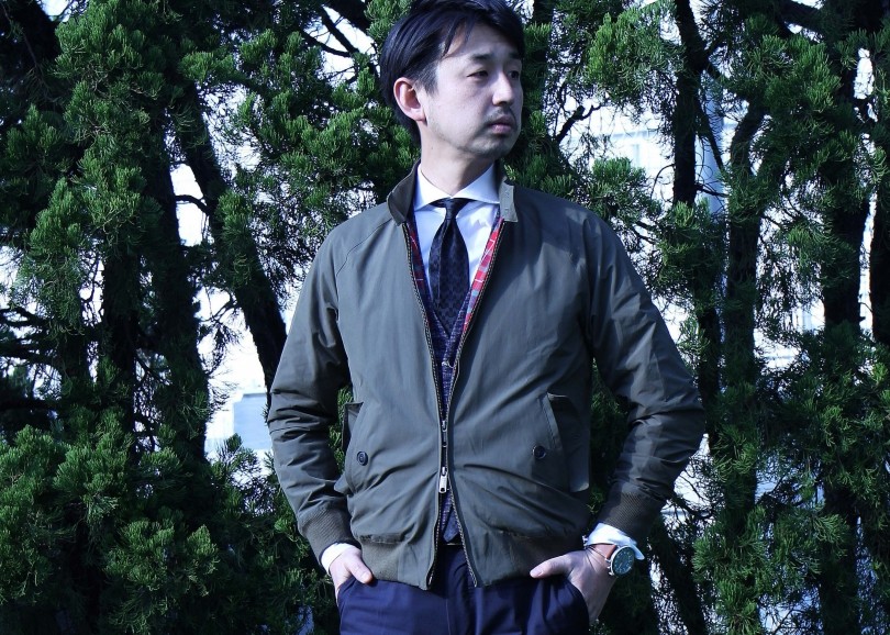 着こなしのバリエーションが楽しめるのも「G9」の魅力ですよね。そのポイントは「ダブルジップ」。加齢によって肩が張って、ウエストのリブがお腹に乗って、ジップを上下で開けると、ちょうど“Xフォルム”になって、ジャケットの中一つ掛けのような感覚で着こなせるんです。ジャケットの裏地も着こなしのアクセントになって、コーディネートがより楽しくなります。