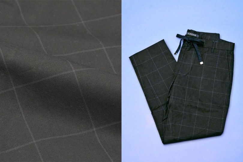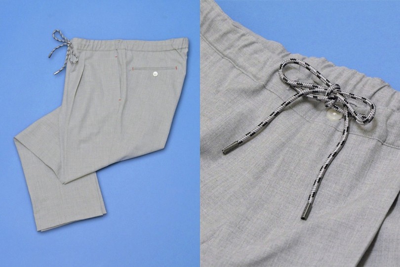 今春、デビューした新ブランド<エアディム>からドローコードスラックスが登場しました。腰まわりはゆとりを持ちつつ、足元にかけてのテーパードシルエットが美しいボトムスは、ストレッチが効いている素材で、クラシカルなウィンドーペンチェックでネイビーとグレーの2色展開。ジャケットとの着こなしも楽しめます。