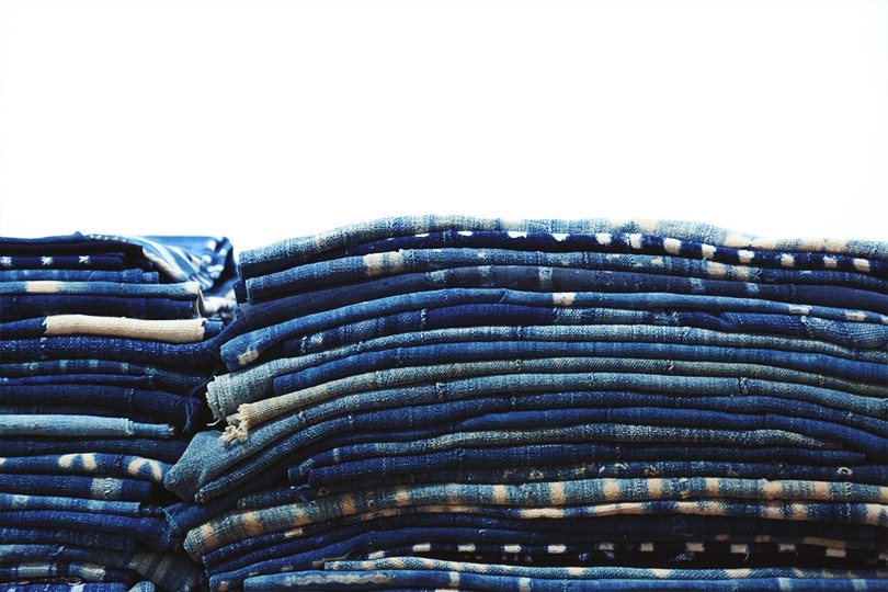 「Indigo」は、中村ディレクターが1年間着用した<ビズビム>定番のデニムパンツを展示しています。このデニムパンツは、繊維の長さが異なる2種類のコットンを使用しており、不均一なスラブが出るのが特徴。他にも岡山の「枷染め」という独特の色ムラが現れる染色法について糸から紹介している他、アフリカや日本の貴重な古布の数々が並びます。