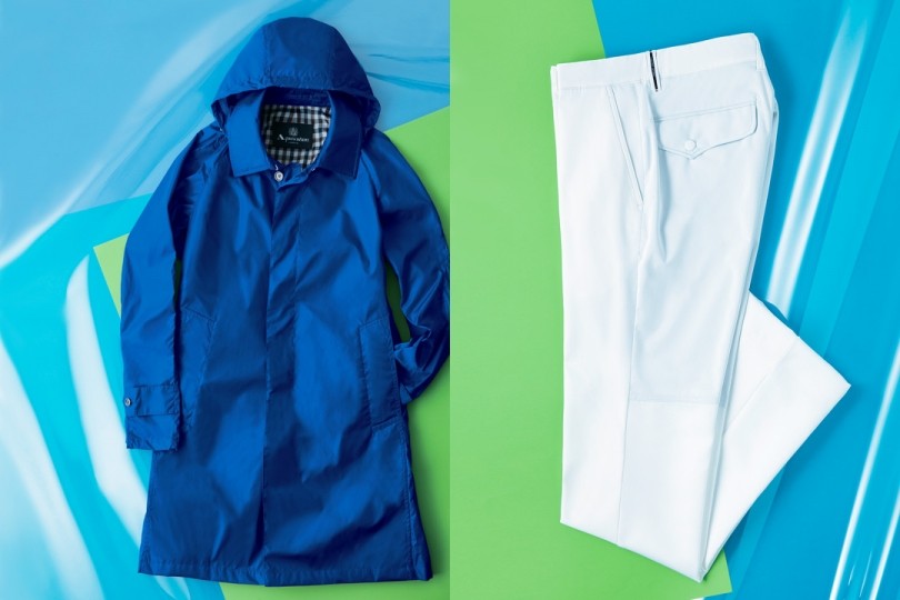 左:イタリアのリモンタ社製のポリウレタンコーティングの平織素材を使用したレインコート。後染めながら、深い色合いが楽しめます。フードは取り外しが可能。<Aquascutum/アクアスキュータム>レインコート 75,600円(メンズ館5階=ビジネスクロージング)