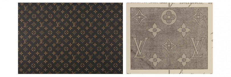 <ルイ・ヴィトン>の現在の「モノグラム」(写真左)と1905年3月21日に<ルイ・ヴィトン>がフランス特許庁へ提出したモノグラム・キャンバスの商標証明書(写真右)。
