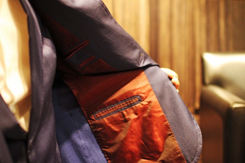 吉川勝也 着心地はとても軽いですが、ビシッとしますね。生地もルビナッチさんが選んでくれましたが、最初選んだのは強めのストライプ系でした。でも、「派手なストライプは仕事では着られない」と伝えたら、この織り感のある生地になりました。どうしてこれですかと聞いたら、「手縫い感が出るような生地にしました」との答え。裏地もワイン色で脱いでもきれいですね。