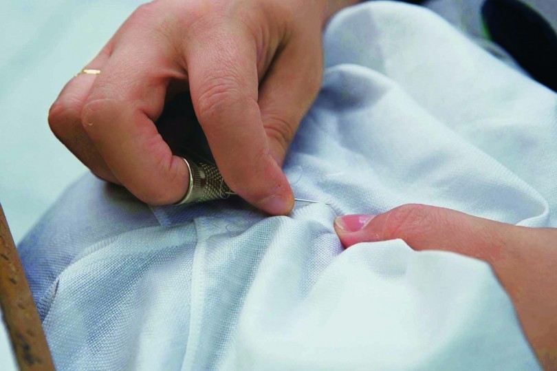 <アンナ・マトゥッツオ>のシャツには、職人の手作業が随所に光る。こちらは袖付けをハンドソーンでおこなっている様子。袖の縫い目とサイドシームが十字ではなく、ずれているのは、袖を後付にしている証である。