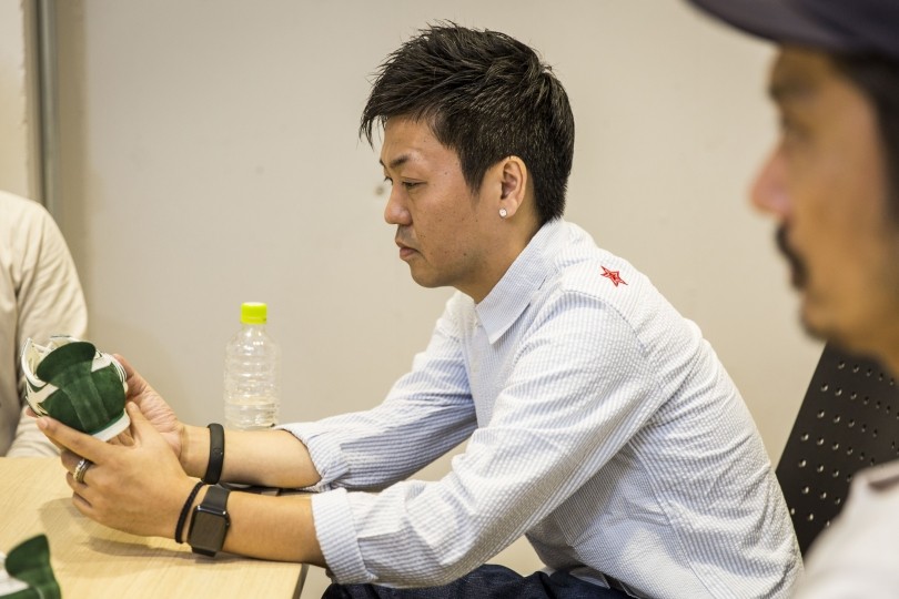 矢作「普段サッカー用のスパイクも手掛けている製造工場に製造を依頼しました。最新鋭の機器を揃えて、最新技術を駆使する工場ではなく、職人の手でひとつひとつ材料を切り、縫い合わせて、接着していく、昭和と同じ製法をいまも継承する工場です。そこで、まずはサンプル作りからはじめてみました」。