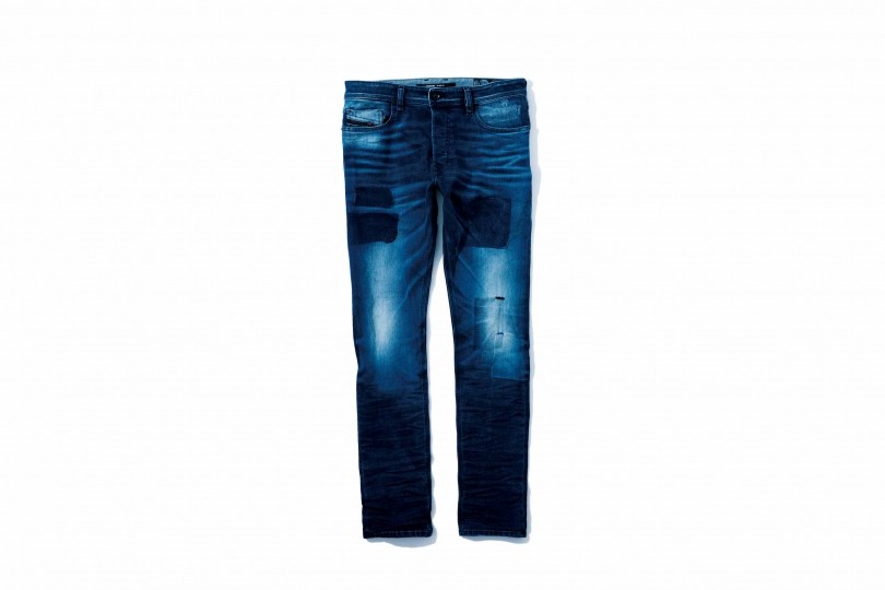 ストーンウォッシュのデニムパンツに、3Dエフェクトなど、さまざまな加工を施した一本。別生地を当てたり、刺し子刺しゅうをするなど、細部に凝ったデニムだ。