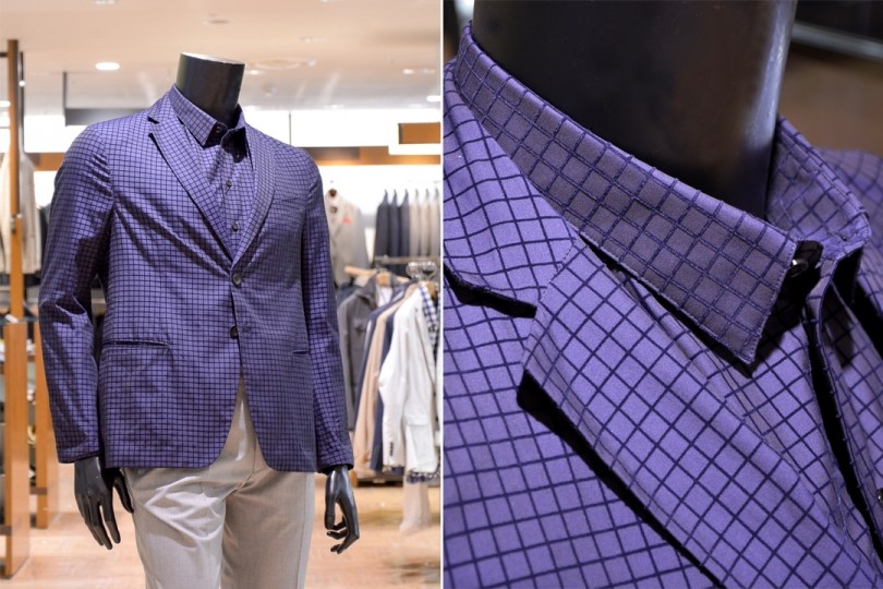 「オンタイム」と「オフタイム」にわけ、それぞれのシーンにふさわしい洗練された雰囲気を表現。ブルーのマイクロチェックのジャケットは、インナーやパンツの合わせるカラーによって、オン・オフを提案。細番手の上質な糸を撚り合わせ、自然なストレッチ性を高めることにより、機能性や快適な着心地を実現しています。