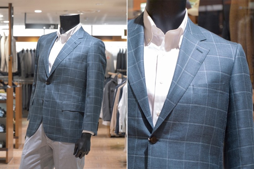 今季はトレンドのダークグリーンを基調とした春らしい爽やかさを演出したコーディネートを提案しています。ダークグリーンを基調としたウィンドウペンのジャケットは、ロロピアーナ社の生地を採用、シャンブレー素材のきれいなパンツにも美しく映えます。