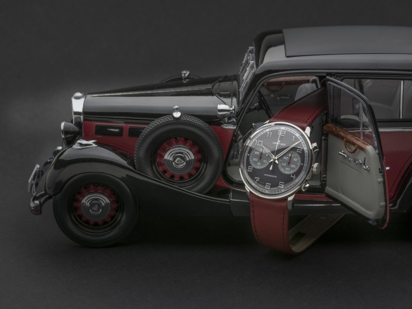 随所にクラシックカーを思わせるデザインを取り込んでいる「マイスター ドライバー クロノスコープ」コレクションは、ダイヤルがスピードメーターを思い起こさせ、過去の時代の車両に搭載されていた計器を彷彿とさせます。大きめなデザインの時・分マーカーはスピードインジケーターを参考にしています。また、ノスタルジックなスタイルのミニッツ・トラックがアクセントとなっています。
