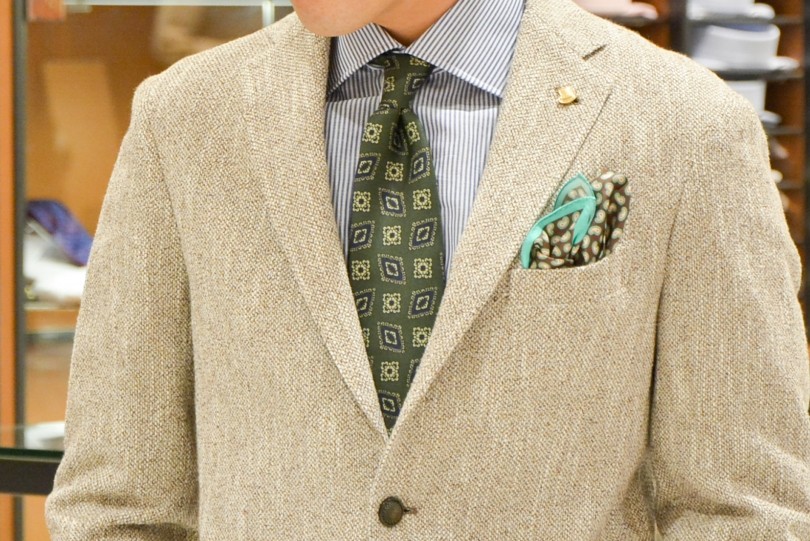 素材感あるジャケットに、麻素材のロンドンストライプシャツと、今季トレンドのアースカラーのネクタイを合わせて春らしいコーディネートに。