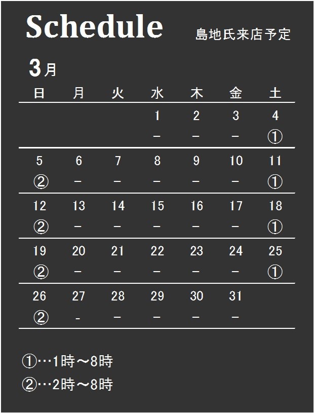 ※都合により、来店予定が中止または変更になる場合がございます。また、時間帯により不在の場合がございます。
