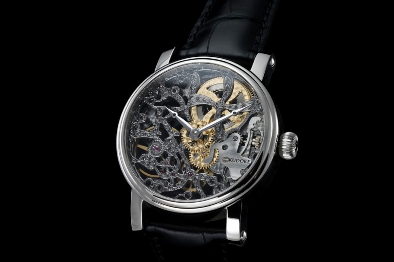 <クドケ>の大きな特徴はスケルトンと彫金にあります。スケルトンは、デザインのスケッチから、ベースとなるムーブメントを手動の糸鋸で切り出して、パーツの磨き、作品の表現を広げるメッキ加工など、クドケ氏本人が行っています。時計製作に必要なすべての作業をほぼ1人で行うことで、思い描いた通りのオリジナリティのある作品を生み出しています。また、<クドケ>の作品で特徴的なのが、彫金に関して手彫りで非常に美しい仕上げが施されていることです。