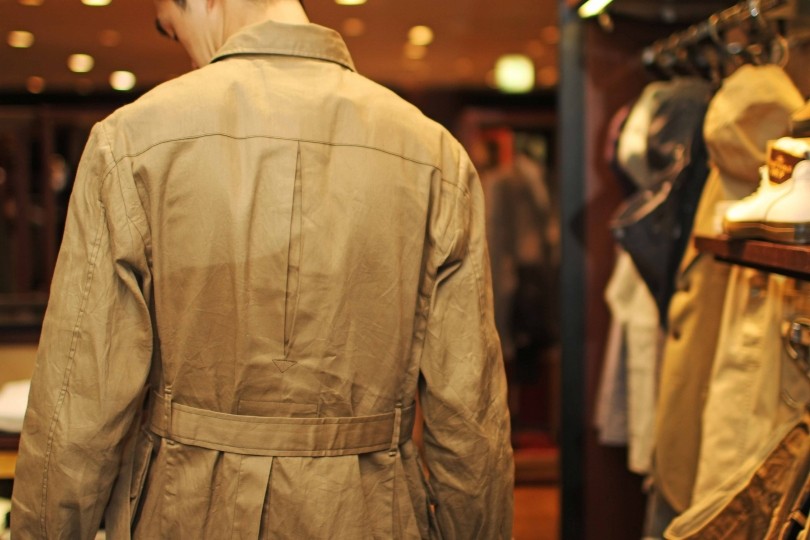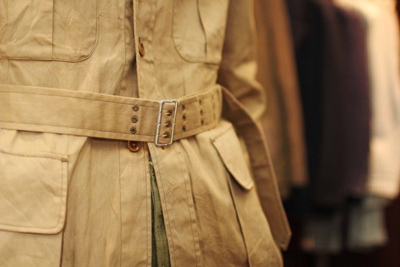 そしてこのサファリジャケットの最大の特徴が、3連の菊穴を開け、特注の3本歯のバックルを備えた太幅のウエストベルトである。40年代のオリジナルは、バックルが尖った針で、ベルトに直接刺して調整していたそうだが、今回はベルトも別注。ベルトの菊穴を使用してウエストマークしたり、トレンチのようにラフに結んだり、後ろで結んだり、ベルトを外してすっきり着ることも可能だ。ベルトをして、デザインを楽しむ着こなしがお薦めだそう。