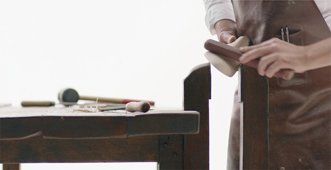 次に、カットされたレザーのピースに、芸術的なステッチを施すための準備を。レザーをより美しく仕上げるために、道具とともに火と水が使われ、高い技術により施される複雑なステッチにより、洗練された美しいデザインが生み出される。