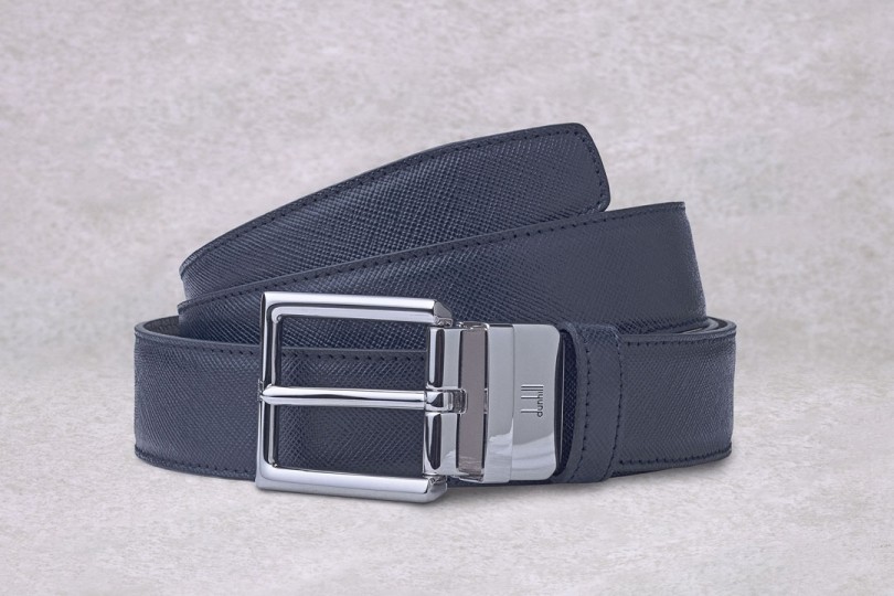 ベーシックな30mm幅のベルトは、ジャケット&トラウザーズのカラーに合わせたネイビーとグレーのリバーシブル仕様。バックルはスタイリッシュなスクエアで、先端のカットを斜めに仕立てさりげないアクセントに。カウハイドのイタリア製サフィアーノ・レザーで傷が目立ちにくく、いつまでも美しくお使いいただけます。