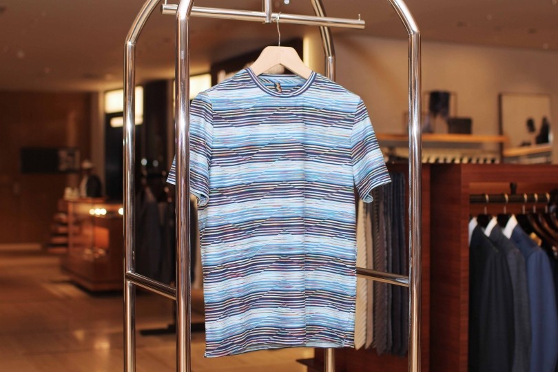 イタリア語で”炎”を意味する”フィアンマート”という<ミッソーニ>を代表する柄を大胆にボーダーにしてあしらったアイコニックなカットソー。レリーフ状の表面に凹凸を施すことで、ジグザグ柄がさりげなく表現された一着は、長い歴史の中で培われたニット技術の高さを感じさせる大人の一品だ。