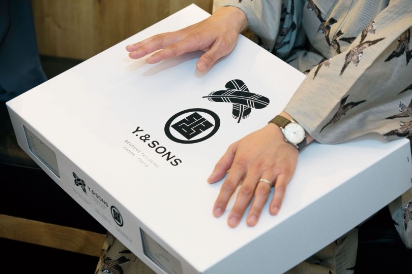 矢嶋 着物の収納といえば桐の衣装箱やタンスが必要だと思っている方も多いと思います。もちろんあればそれに越したことはないのですが、<ワイ&サンズ>では専用の収納箱を付けています。ボール紙なので頑丈ですし、吸湿性にも優れる。一からデザインした家紋を箔押しして仕上げた、こだわりの箱なんです。