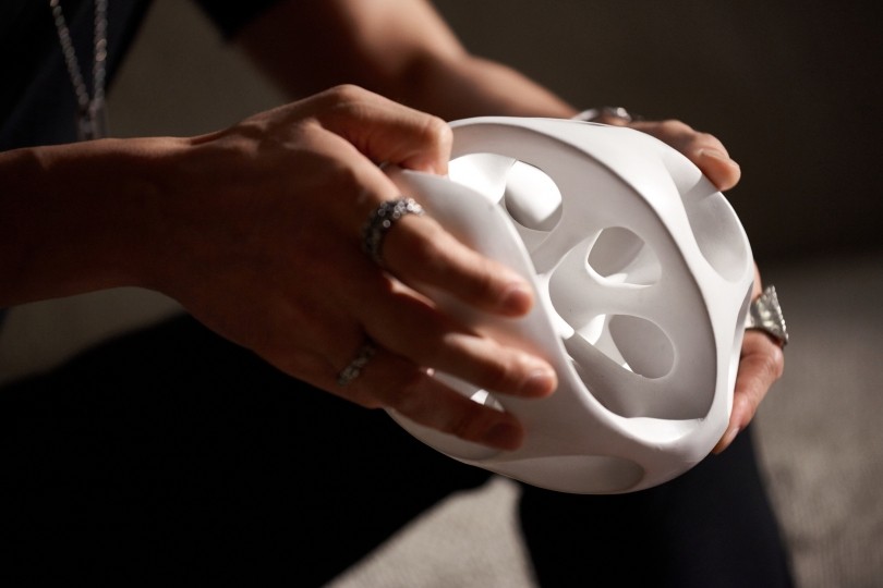 「この白のオブジェは2010年ぐらいに作ったもので、造形としてのレベルアップのきっかけになったものです。これを作るまでの自分の立体のとらえ方は“表と裏”で、それは“虚と実”の組み合わせでもあるのですが、このオブジェは虚の部分に造形を付け足すことができたもの。くり抜いた虚の部分に新たな造形を加えることで複雑さが生まれ、見え方の多面性が表出しました」と説明。