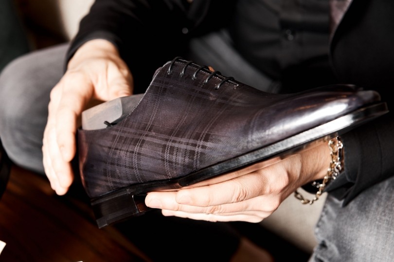 「これは伊勢丹のために一からつくりあげたコレクションでフレックスといいます。その名のとおり抜群にしなやかで返りがいいコンストラクションが特徴です。手染めの靴はイルチアのヌメ革を、黒革の靴はゾンタの最上級ラインを採用しました」