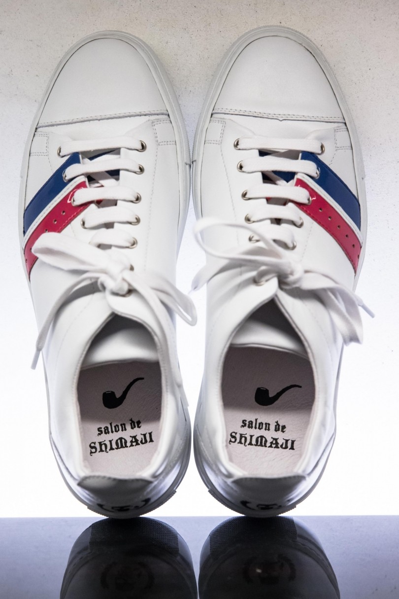 ホワイトを基調としたシンプルデザインにエナメルのブルーとレッドのラインが入り、踵部分には<サロン ド シマジ>のトレードマークであるスカルが入った一品です。