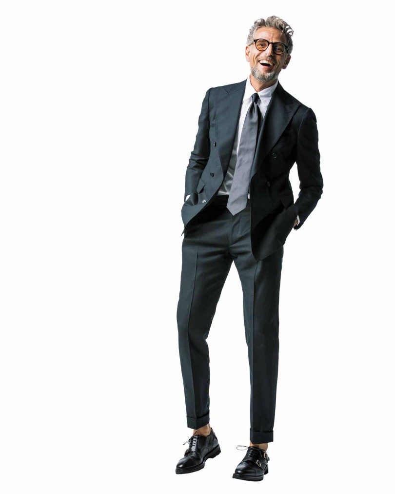 キメのスーツ姿をキッチリかつちょい遊んだ風に仕上げます─ダブルのブラックスーツの足元にも難なくハマり、かついい意味での違和感が足元に漂う、というのがキモなのです。エナメルの光沢感がスタイル全体に艶っぽさをさり気なく加味してくれますよ!