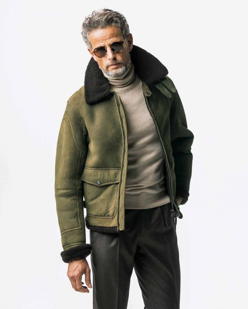 アメカジのワイルドなイメージが強いかもしれませんが、モダンで軽~い仕立てのものをチョイスして、あたかもジャケットのように着るのがお洒落なイタオヤ的ヤリクチ。どうです、写真のようにほどよくタイトに仕立てられたムートンブルゾンをあたかもジャケットのようにタートルやスラックスと合わせる、とタフなニュアンスとエレガンスが同居したメリハリのあるコーディネートが完成するわけ。ポイントはヘビーすぎないムートンを選ぶこと。