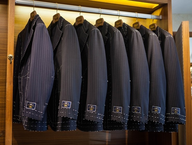 特筆すべきは、ボタンホールやラペル(上衿含め)のハ刺しなどもフルハンドのビスポーク同様の手作業で行っており、限りなくビスポークに近いということ。これは、通常のテーラーが提供するメイド・トゥ・メジャー、パターンオーダーでは考えられないクオリティを実現している。また、オーダーメニューは、2ピース・3ピース・ダブルブレスト・コートの4種類。特別仕様のゲージ服で採寸と補正を行い、韓国工房にて縫製し、約2ヶ月後にお渡しとなる。