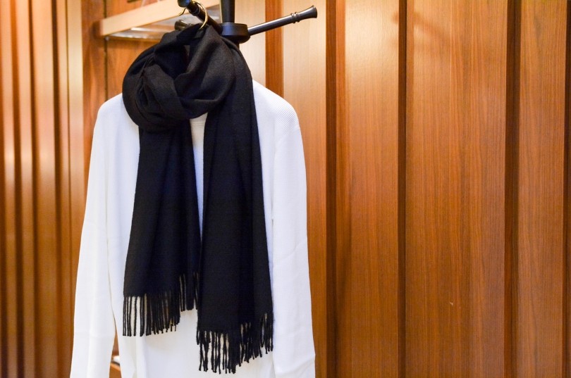 シンプルでどんなアウターにもマッチする大判ストールと小判ストール。大判ストールで色んな巻き方を楽しむのもよし、小判ストールでシンプルに男らしく巻くのもよし、な一点です。
