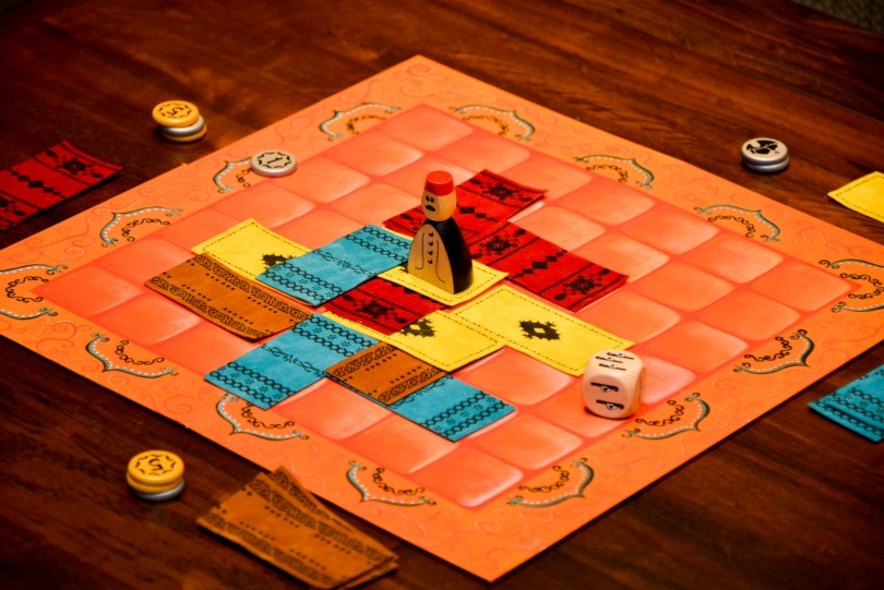 最後にご紹介するのがMARRAKECH(マラケシュ)です。ゲームの舞台はマラケシュ広場のじゅうたん売り場。自分のじゅうたん売り場をどれだけ作れるか、といった陣地とりゲームです。ルールは、サイコロを振り、出た数字のマス目分商人(人形)を進め、止まったマス目に対して自分のじゅうたんを敷き陣地を獲得。広場に自分のじゅうたんができるだけ上になるように敷きつめ、最終的に一番多くのじゅうたんと資産を持っているプレイヤーの勝ち。奥深いながらも一度プレイを始めるとどんどんのめり込んでいく大人の方も楽しめるような確率論を利用した頭脳派ゲームです。