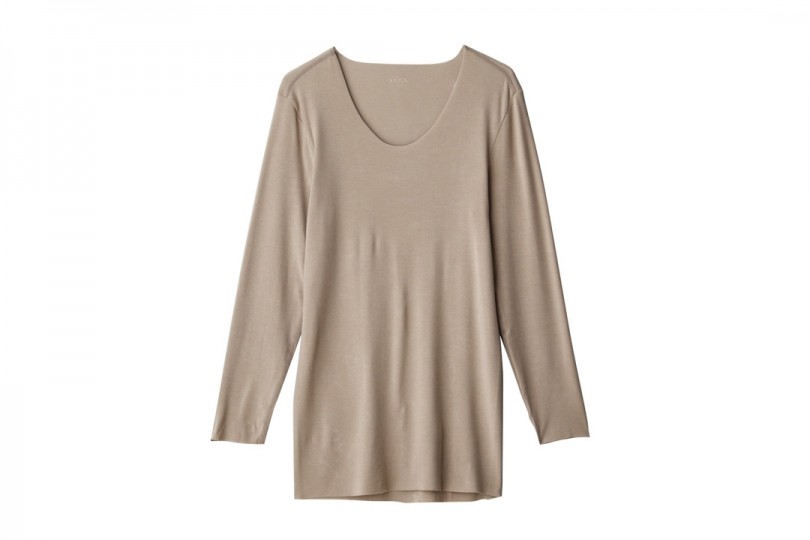 マイクロ モダール®エアーを使用し、やわらかい触感で肌になじみがよい一枚。身体から出た湿度を熱に変え温かさにも優れています。シャツに響きにくいカットオフ仕様ですっきりと着こなせます。