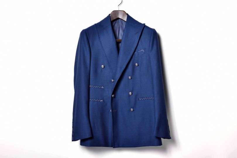 人気の<タリアトーレ>からは、デッドストックのメタルボタンを使ったダブルブレストの紺ブレ「ピエール」を。チェンジポケット、マニカカミーチャといったトレンドのディテールデザインは、デザイナー、ピーノ・レラリオ氏のグラマラスな世界観が伺える。