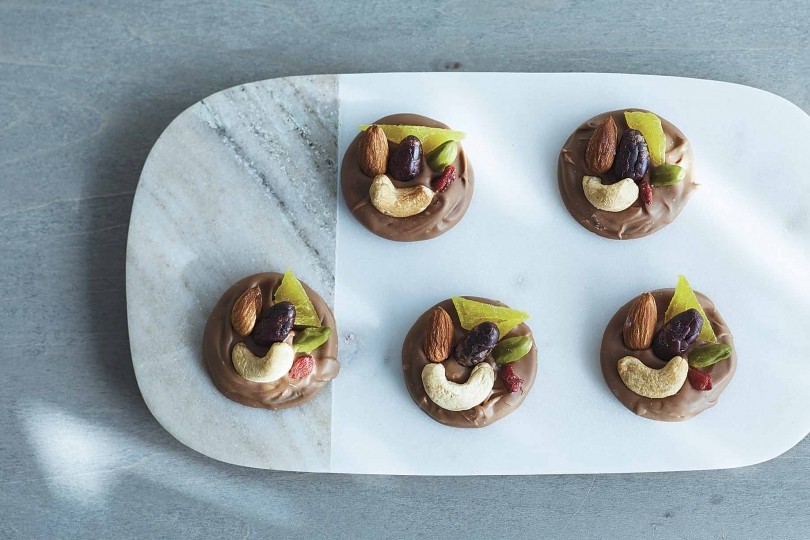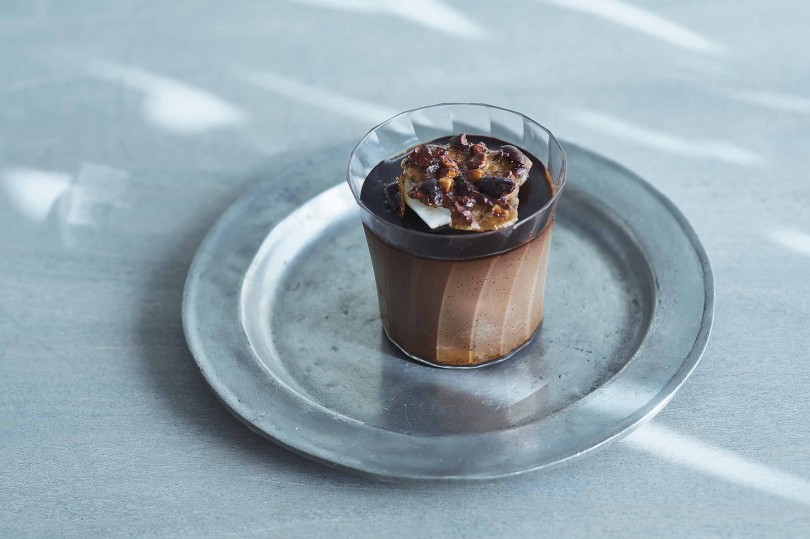 ほんのりスパイスとオレンジが香るショコラプリンに、〈Dari K〉のローストカカオとアーモンドのヌガティーヌをトッピングしました。カカオ豆の香ばしさと食感が楽しい。