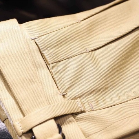 イセタンメンズが今注目するナポリのファクトリーブランドの一つだが、ナポリ然としたディテールや柔らかく軽いフィッティング、美しいドレープ感など、実に良い作りをしている。“ナポリ生まれ”を象徴するジャケットの裾まで貫通するフロントダーツをはじめ、広めのラペルや極めて薄くした副資材が入った肩回り、袖付けのいせ込みのふんわり感、さらにパンツの縫い代のハンドステッチによる片倒しやタックのかんぬき止めなど、すべてが丁寧な手仕事を感じさせて、気品がほんのりと漂ってくる。