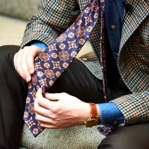 <スパッカ ネアポリス>は、ナポリらしい軽い仕立ての三つ巻き(大剣と小剣に裏地を使用せず、縁を細かく縫い上げる縫製仕様)ネクタイを中心としたブランド。昔のアーカイブをモチーフに彼がデザインした生地も魅力的で、いわば「古い技術を新しくする」のは<ルカグラシア>を主宰するルカと近い感性を持っている。オーダー会のネクタイは、幅と長さのほかに、セッテピエゲと三つ巻きも選ぶことができた。